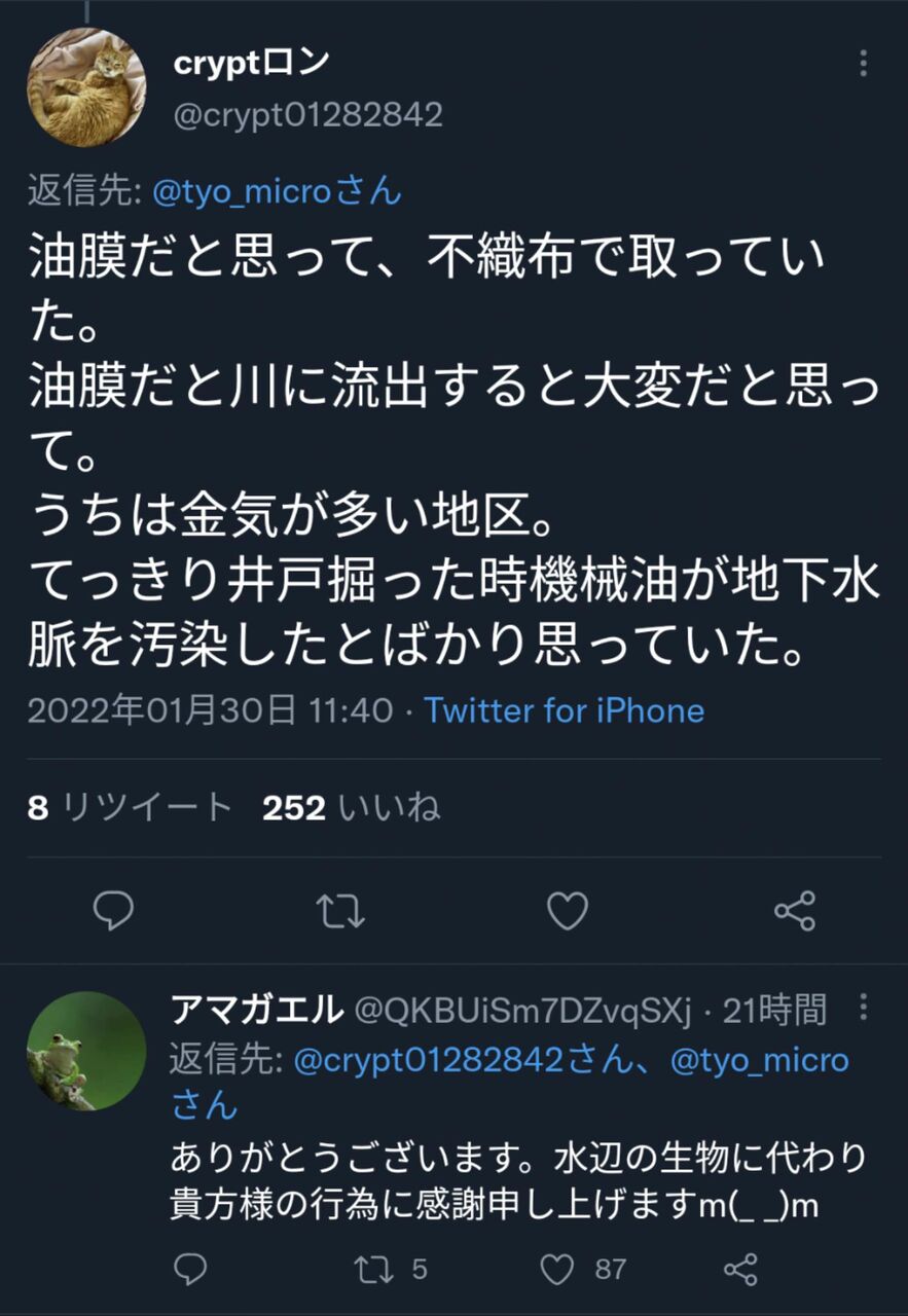 鉄バクテリアっていう土壌に住んでるバクテリアが作る皮膜で油膜じゃないらしい